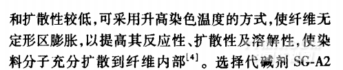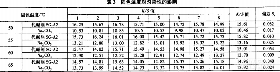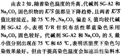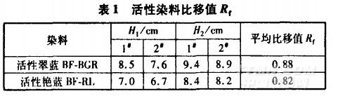 從表1可知,兩只染料的比移值甩都小于0.9,表明染料直接性小【2】。這兩只染料的分子結構均較大.吸附與擴散速率較慢,移染性差,染色平衡時間相對較長,容易染花。活性翠藍一般為酞菁染料,其母體分子較大,所以溶解度較低口J。由于鹽析效應,活性翠藍溶解性會進一步降低,造成染料凝聚,形成表面染色,對勻染不利。因此,要解決T/R針織布翠藍色花,要從提高染料的反應性、擴散性,以及降低固色速率和減少固色色花等方面著手。