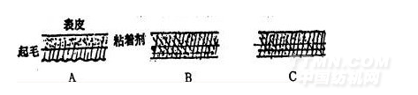 層壓工序是合成革生產(chǎn)中的關(guān)鍵部份,掌握好層壓條件,對(duì)產(chǎn)品的質(zhì)量風(fēng)格具有極大的影響,而不適當(dāng)?shù)膶訅簵l件,造成產(chǎn)品剝離強(qiáng)度的下降、或轉(zhuǎn)移后花紋的不清晰,以及表面起縐現(xiàn)象……等等。以起毛布的層壓為例,當(dāng)粘合劑浸漬起毛部的2/3情況下[圖4(C)]合成革表面平正狀態(tài)好,見(jiàn)圖4所示;