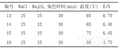 依據正交實驗得出的染色溫度的優水平,改變染色溫度,從而研究出最佳染色溫度。實驗方案參見表6,織物2g,浴比1:50。