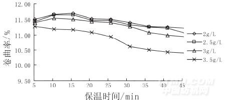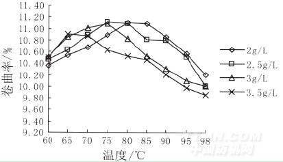 從曲線圖可知,在相同堿濃度下,溫度75℃之前,隨著溫度的升高,卷曲率有明顯提高,但當溫度高于75℃以后,卷曲率開始快速減小。