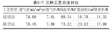 從表3-7可看出,聯合改性的工藝中織物擴散面積、透氣率、保溫率有所提高,透氣量減小這是因為羽毛蛋白助劑缺乏反應性基團,與滌綸織物結合不牢固,除了有必要的高反應性交聯劑外,還需要選擇合適的改性工藝方法及條件,浸漬改性后的織物再進行高溫焙烘,使纖維分子鏈運動加劇,纖維分子中內應力降低,結晶度和晶區有所增大,非晶區趨向集中,將羽毛蛋白助劑,交聯劑與纖維結合的更加緊密,更加牢固,纖維表面親水性基團增多,復配羽毛蛋白處理到織物上,在織物表面形成一層不完整的親水性膜,導致透氣量有少量降低,滌綸織物舒適性能有所提高。所以選擇浸漬與浸軋聯合的改性方法處理滌綸織物。