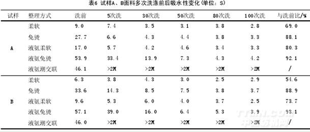 由表6看出,除潮交聯整理面料外,其它整理方式的面料隨著洗滌次數的增加,水滴滲透擴散時間逐漸縮短,面料吸水性逐漸增強。