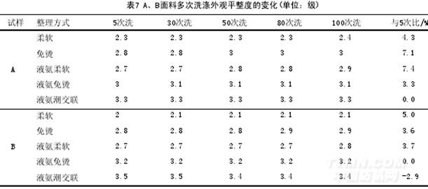 隨著洗滌次數的增加,柔軟、液氨柔軟、免燙面料洗后外觀平整度有所改善,主要原因是洗滌多次后纖維蓬松,紗線柔韌性增加。