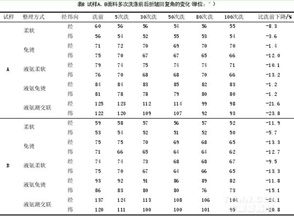 表7 A、B面料多次洗滌外觀平整度的變化(單位:級)由表7看出,面料經免燙整理或液氨整理后外觀平整度增加半級,液氨免燙整理增加近1級,液氨潮交聯后免燙性增加1級以上。通過折皺回復角檢測(見表8)也可看出面料經過免燙或潮交聯整理后抗皺性明顯增加。