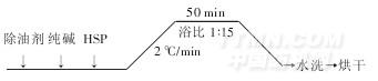 織物:滌綸油絲布、氨綸絲(市售).自制全滌綸油污布:將黑機油、齒輪油按一定比例混合,用膠頭滴管均勻滴加油滴在水平掛于針板架的織物上,待油滴擴散后,170 ℃焙烘90 s 待用.藥品:除油劑HS-101D、除油劑HS-101F、螯合穩定劑HSP(浙江華晟化學制品有限公司),除油劑A(廣東某公司),除油劑B(杭州某公司),純堿(市售),齒輪油,機油(礦物油).儀器:JJ200 型精密電子天平(常熟雙杰測試儀器廠),S.C.101-6 型鼓風電熱恒溫干燥箱(浙江省嘉興市電熱儀器廠),容聲脫水機(廣東容聲電器股份有限公司),RY-1180Y 型高溫染樣機(上海龍蕓電子科技有限公司).