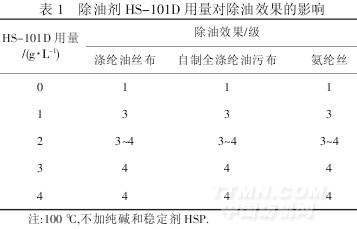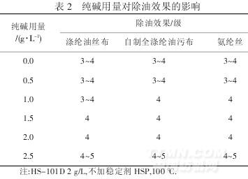 從表1 看出,隨著除油劑HS-101D 用量的增加,除油效果增強,3 g/L 時,除油效果較空白提高了3 級,說明除油劑HS-101D 本身對織物油漬乳化及分散作用好,無需借助堿劑對油漬分解即可發揮除油作用,繼續增加用量,除油效果增加不明顯.