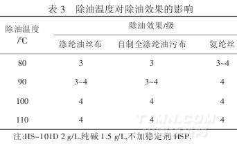 從表3 看出,80 ℃時,除油效果達到3 或3~4 級;90 ℃時,可達3~4 或4 級;100 ℃時,可達4 級.原因是隨溫度升高,除油劑對油漬的溶解度增大、乳化程度增強,使溫度對除油效果有增強作用.綜合考慮,選擇滌綸除油溫度為100 ℃,氨綸絲為90 ℃.