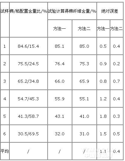 從表2中數據可以看出,方法一的6次試驗之間的絕對誤差相對比較大,尤其當粘纖含量較高時,因此方法一的穩定性相對較差;而方法二的6次試驗之間的差異不是很明顯,且都明顯好于方法一。