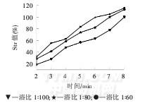 由圖3、圖4可以看出,相同火力條件下,浴比同,染色時間越長,Str值越大,顏色也就越深;時間相同,浴比越小染得的顏色越深.原因是相同浴比下,時間越長,水溫越高,越接近腈綸的玻璃化溫度,或在腈綸玻璃化溫度以上的染色時間越長,織物得色越深;相同時間內,浴比越小,染液的總體積越小,在火力一定的條件下,織物處于高溫段染色時間就越長,因而織物得色越深.