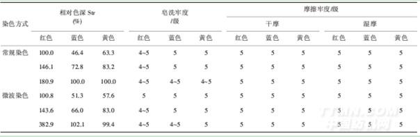 由表2可看出,用微波方法染的織物皂洗牢度及摩擦牢度與常規(guī)方法染的織物牢度都很好,均達(dá)4~5級及以上,并且深色織物的皂洗牢度比淺色織物稍微差些.
