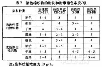 由表7可看出,改性漂白棉織物的耐洗色牢度和有所提高,說明經過改性劑wLS改性的棉織物,不僅干、濕摩擦色牢度均比未改性漂白的棉織物相應指標有利于染料吸附及向纖維內部擴散,并與纖維發生牢固結合。另一方面,改性劑wLs還可作為交聯固色劑,其與纖維發生反應的同時,有可能與水解活性染料反應,增大染料與纖維之間作用力,從而改進染色棉織物的耐洗色牢度和耐摩擦色牢度。