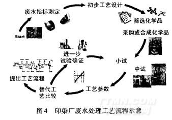 圖4是一個廢水處理廠開發(fā)的廢水處理工藝流程示意,它強調(diào)了工藝開發(fā)過程中迭代的重要性。首先是廢水指標的測定,隨后根據(jù)經(jīng)驗或做嘗試性的初步工藝方案設(shè)計,然后篩選化學(xué)品(實驗室合成或購買)、小試和中試,在試驗中獲得沉淀池的色度去除效率、吸附速率常數(shù)、吸附容量和反滲透膜的擴散效率等參數(shù)。對一些替代工藝進行評估以確定最佳工藝。通常,還要進行其它的試驗以獲得一些補充數(shù)據(jù),從而對設(shè)計方案進行改進。