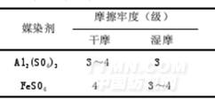 別作為媒染劑進行染色的樣品的干濕摩擦牢度都較好,這主要與染料分子的結構及染料與媒染劑的結合狀況有關,染料與媒染劑絡合,增加了摩擦色牢度。由于染料用量2%(omf)不是很高,織物表面浮色較少,也是牢度較好的原因。