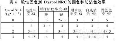 表6表明,DyapolNRC可大幅改善尼龍/氨綸印花織物的色牢度,色變極少,可滿足高色牢度的錦綸/氨綸織物印花質量和生產要求。