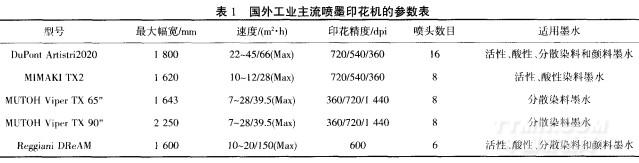 早期的噴墨印花機是由噴墨¨印機改裝成,豐要為帶電液滴型(若排除基于電磁閥控制的染料噴射地毯用印花機),即連續噴墨(CIJ)型.I雖然噴墨印仡機是由噴墨打印機改裝過來的,但是紡織品印花用的數字噴墨印花設備又有許多不同的要求:具有較大鍆印的寬度;平穩可靠的導帶裝置和烘干功能;合理的印花速度;適合不同織物組織結構的圖像處理軟件和控制系統.因此,噴墨印花機比辦公室打印機更為復雜,要求也更高.11國際市場上主要的制造商有DuPont(美國)、MIMAKI(日本)、MUTOH(日本)、Reggiani(意大利)、Xennia(英國)、Kornit(以色列)和Stork(荷)等公,比較流行的噴墨印花機型號有DuPontArtistri2020、MIMAKITX2、MUTOHViperTX和ReggianiDREAM等(主要參數見表1).