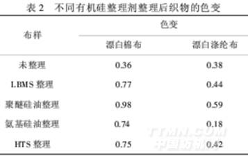 根據CIE1976L*、a*、b*總色差值與牢度級別的關系可知,△E≤0.2,色差為5級,△E≤0.8,色差為4~5級.從表2可以看出,氨基硅油整理后的織物色變最小;聚醚硅油整理后織物的色變最大;而LBMS、HTS整理后織物的色變較小.產生色變的原因比較復雜,除了人們普遍認為的氨基被氧化變色外,染料被氧化、乳化劑的增溶效應及高溫時纖維結構被破壞等也是產生色變的重要原因.染色織物在高溫定形時,染料分子活動加劇,部分結合不牢固的染料會脫離纖維熱遷移或升華,染料在向外層(包括織物表面和空氣中)擴散時若沒有受到阻礙,織物最后的色澤將主要體現為表層染料的色光;若受到阻礙(硅油成膜),發生熱遷移的染料將在織物表面聚集,最后的色澤較為復雜,一方面表面染料濃度增加,另一方面硅油膜改變了光線的折射率,加上氨基在高溫情況下被氧化等,使織物的顏色變深變暗.[7]由于氨基硅油覆蓋在纖維表面并形成一層疏水性的薄膜,防止染料與溶液接觸而溶解,有一定固色作用,減少了染料的脫落,起到了減少色變的效果.