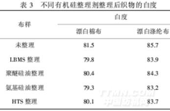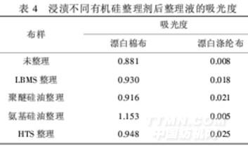從表3可以看出,整理后織物白度都有一定程度的降低.聚醚硅油不含有氨基,不存在氨基被氧化而產生發色基團,其白度下降最小;氨基硅油則與之相反,其白度下降較大;LBMS和HTS采用了特殊的結構設計,其酰胺基或季銨鹽基具有較強的抗氧化能力,經整理的織物抗黃變性強,白度下降較小.