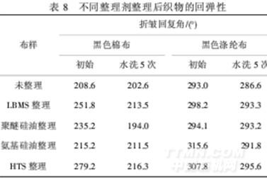 從表8可以看出,經整理劑整理的織物跟原樣相比回彈性能有所提高,水洗后織物跟初始織物相比回彈性能有所下降.經整理劑整理后織物的纖維與整理劑間發生部分化學交聯,起到固定纖維位置的作用,從而提高了回彈性能.