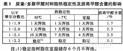 由表1可知,隨著尿素/多聚甲醛摩爾分?jǐn)?shù)比減少,樹脂的熱穩(wěn)定性提高。當(dāng)U/F<1:2.0,樹脂含亞胺基多,樹脂熱穩(wěn)定性差;當(dāng)U/F>1:2.0時(shí),樹脂中生成的羥甲基基團(tuán)增多,甲醚化后穩(wěn)定性提高。從表1可以知道,當(dāng)U/F=1:2.2時(shí),樹脂液非常穩(wěn)定;而隨著U/F摩爾分?jǐn)?shù)比的減少,游離甲醛增加。本試驗(yàn)選取U/F=1:2.1。