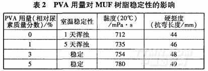 聚乙烯醇(PVA)是一種很好的膠黏劑,能與甲醛或脲醛的初縮體進(jìn)行反應(yīng),增加樹脂的黏著力,同時(shí)具有一定的捕醛作用。改性劑PVA的加入量對(duì)MUF樹脂的穩(wěn)定性影響見(jiàn)表2。