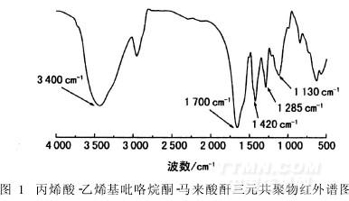 對合成的丙烯酸-乙烯基吡咯烷酮-馬來酸酐三元共聚物Poly(AA-MA-VP)進行紅外光譜分析,如圖1。