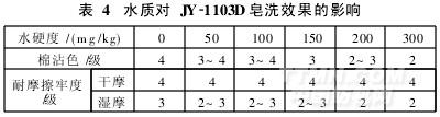取JY-1103D用量為1 g/L,皂洗溫度70℃,時間20 min,浴比1∶15,不同硬度水中的皂洗效果見表4。
