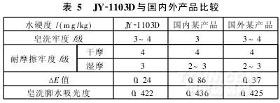 在pH值7~8,水硬度為100~150 mg/kg,皂洗劑用量1 g/L,皂洗溫度70℃,時間20 min條件下,將JY-1103D與國內(nèi)外同類產(chǎn)品進(jìn)行比較,結(jié)果見表5。