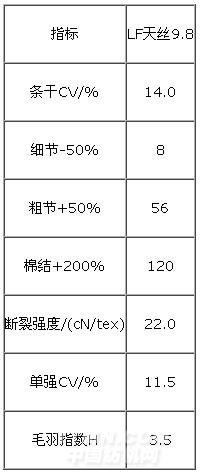 根據USTER統計規律推導100%粘膠紗(環錠紡)9.8tex成紗指標,我們制定LF天絲9.8成紗指標介于50%與5%之間,指標如表3。