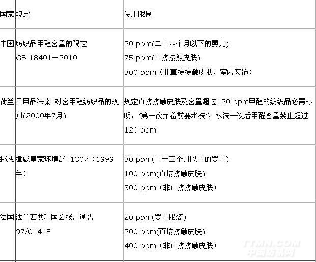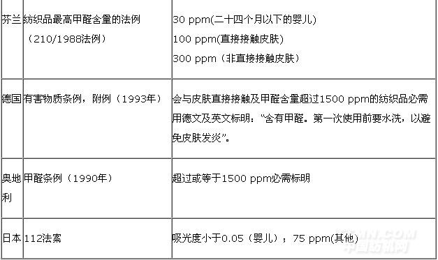 自20世紀80年代以來,世界主要國家紛紛出臺相關的法規或強制標準,對產品的游離甲醛含量作了嚴格的限定(見表1)。
