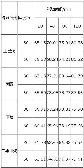 在對樣品進行前處理過程中,最主要的是選擇最佳的提取方式和提取劑,使得目標物盡可能的被提取出來。因此本文采用液液萃取[3]、超聲波萃取[4]和索式萃取[5]三種方法對樣品中短鏈氯化石蠟的提取進行優化。