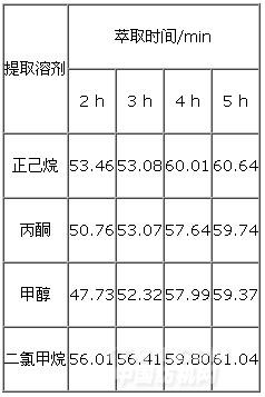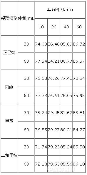 從表1可以得到,在不同時間內用提取溶劑為正己烷、丙酮、甲醇和二氯甲烷對短鏈氯化石蠟進行提取,當提取溶劑體積在30mL時回收率的范圍分別在65.13%~80.38%、63.13%~81.79%、56.71%~79.90%和61.78%~73.36%,當提取溶劑在60mL時回收率的范圍分別在66.53%~81.52%、65.50%~82.66%、60.41%~78.66%和61.51%~75.61%在回收率的總體趨勢是隨著提取溶劑的體積的增加,液液萃取的時間的增長其回收率逐漸增加。