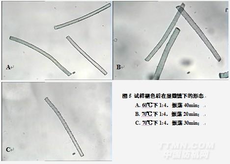 圖5表明,當試樣與保險粉量比在1:4時,在水浴溫度為60℃和70℃時深色羊絨纖維褪色效果很好。在顯微鏡下,羊絨纖維特征更明顯。研究表明在70℃條件下處理30min后,能通過對其鱗片結構、間距、密度、厚度和開口角等特征做出較為準確的鑒別且在顯微鏡觀測下羊絨的損傷較小。