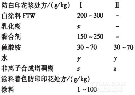(3)硫酸銨和檸檬酸用量應(yīng)根據(jù)活性染料印制的深淺和防印難易加以調(diào)節(jié)。檸檬酸的防印效果和對(duì)印花色漿的貯存穩(wěn)定性均優(yōu)于硫酸銨,一般色防印花大多采用檸檬酸。