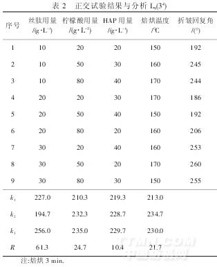 綜合折皺回復角、白度、撕破強力各項指標認為,絲肽/檸檬酸體系最適于作為絲綢的抗皺整理劑,故設計正交試驗,優選絲肽/檸檬酸整理柞蠶絲綢的最佳工藝參數.