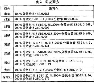 以花號E081104-9為例,工藝處方見表2。表2配方中,均加人增稠劑0.05kg,滲透劑0.03kg,消泡劑0.O1kg。