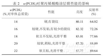 由表2 可知,當w(PCDL)=18%時,膜的軟硬程度最佳,不發(fā)粘,且光亮度較為理想.可能原因是光亮型聚丙烯酸酯中的聚碳酸酯二元醇分子結構規(guī)整,成膜時易產(chǎn)生定向結晶,且膜平整光滑,故光亮、機械性能都較好.[5].