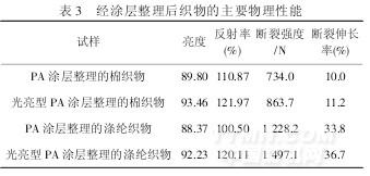 由表3 可以看出,光亮型聚丙烯酸酯膜較普通的聚丙烯酸酯膜的亮度和反射率有了一定程度的提高,經(jīng)光亮型聚丙烯酸酯涂層整理的織物斷裂強度較高,可能是因為光亮型聚丙烯酸酯的結晶結構排列規(guī)整,光澤性能較好,聚碳酸酯鏈段在拉伸取向過程中會產(chǎn)生應力取向,使得光亮型聚丙烯酸酯涂層膜有較好的力學性能.