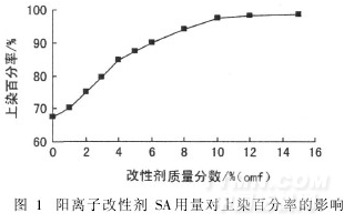 2. 1. 1 陽離子改性劑SA用量對上染率的影響改性液pH值12,分別使用不同質量分數的陽離子改性劑SA對前處理后的木棉纖維于75℃改性處理45 min,再用活性染料染色,測得上染百分率見圖1。