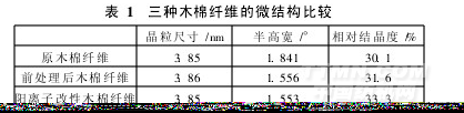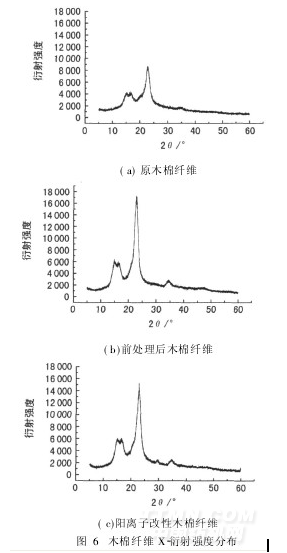 圖6(a)、(b)和(c)分別是原木棉纖維、經(jīng)前處理和8% (owf)陽離子改性劑SA于75℃處理45 min后的木棉纖維的X射線衍射強度分布。表1為在2θ=23°處衍射峰的半高寬及計算得到的纖維晶粒粒徑和結(jié)晶度的對比。