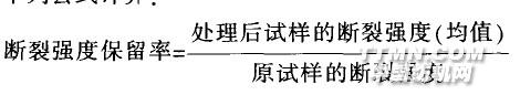 Wo---織物原試樣質量;W1--- 處理后織物試樣質量(2)斷裂強度保留率測定:距織物邊10 cm以上處取樣。扯去邊紗,測試5次取算術平均值,結果按下列公式計算: