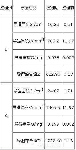 可見未做整理的滌綸織物的毛細效應綜合值很小,織物液態水傳導能力很差,那么其吸濕排汗的能力也很低。對比A與B整理劑毛細效應綜合直,經過A整理后的試樣毛細效應綜合值最大,織物的液態水傳導能力很強,織物的吸濕排汗能力也將很好。充分反映出經新型整理劑A整理后對織物吸濕性的影響是巨大的。