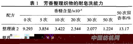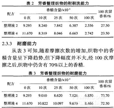 從表2可以看出,隨著刷洗次數(shù)的增加,織物中香精含量逐漸降低,經(jīng)100次刷洗后,織物上仍有20%以上的香精,原因是香精微膠囊粒徑較小,粒徑分布在0.4~3Ixm,與粘合劑的接觸表面積較大.