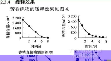由圖4可知,純香精整理過的織物香味損失很快,一周之內(nèi)香精基本揮發(fā)殆盡.織物經(jīng)微膠囊整理后,前3個(gè)月織物上的香精含量減少速率較大,3個(gè)月之后,織物上香精含量減少幅度較小,香精釋放速率相對緩慢.當(dāng)織物放置7個(gè)月之后,仍含有5%左右的香精,織物保持清淡的香味.由此看來,將香精微膠囊化后整理到棉織物上,可以達(dá)到緩慢釋放香味、持久留香的效果.