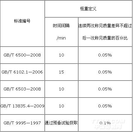 五個標準對回潮率/含水率的測定都是采取烘箱法,稱取一定量的試驗試樣,置于一定溫度的烘箱內烘驗,使試驗試樣中的水分蒸發,直至試驗試樣達到恒重,然后按照公式計算得到。但是五個標準中對恒重的定義存在差異,見表1。