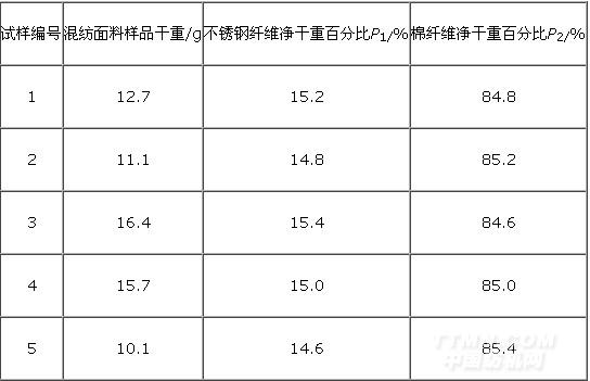 實驗按2.3.1的操作步驟進行,其中步驟1)的取樣量應不少于10 g,實驗次數設為5次。經過步驟4)計算得到不銹鋼纖維的凈干重百分比P1后,再計算棉纖維的凈干重百分比 , 。實驗進行5次,將實驗結果平均,即可得該種棉/不銹鋼纖維混紡防輻射面料各組分的凈干重百分比。