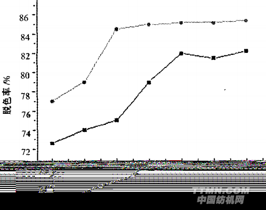 由圖2可以看出,當(dāng)投加量為8O mg/100 mL時(shí),泥炭對活性嫩黃K-6G的脫色率可達(dá)82 ,加大投加量,脫色效率提高不明顯。對于此種染料液,最佳投加量為8O mg/100 mL。對活性深藍(lán)K—R,最佳投加量為60 mg/100 mL,脫色率達(dá)85 。