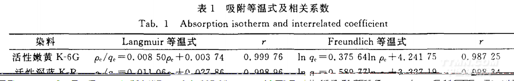 方程可表示為: qe/P e一1/(bq max。 +P e /qmax);Freundl—ich方程可表示為:inqe一InK+ … In P e。式中qmax為單層飽和吸附量;b,k,n 均為常量。 由實(shí)驗(yàn)數(shù)據(jù)擬合 得到的活性深藍(lán)K—R、活性嫩黃K一6G的吸附等溫式及相關(guān)系數(shù)r見表1。