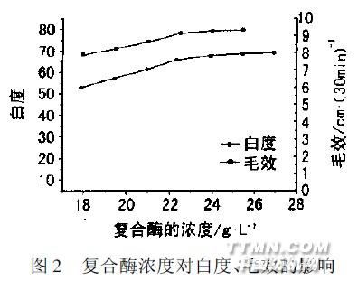 式中:W0———退漿前織物重量W1———退漿后織物重量。2 結果與討論2. 1 汽蒸工藝的退煮效果2. 1. 1 改變復合酶濃度當pH 值為9 ~ 10. 5,汽蒸30 min 時,改變復合酶濃度,退漿效果見圖1,白度、毛效見圖2。.jpg)