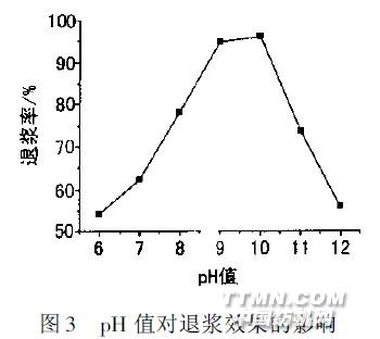 由圖3 知,不同pH 值時的酶退漿率變化很大。pH 值呈強酸、強堿性時,酶退漿率降低;當pH 值在8. 5 ~ 10. 5 之間,酶退漿率達最大值。2. 1. 3 汽蒸時間的影響