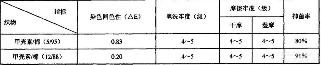采用上述最佳改性工藝,對(duì)甲殼素,棉混紡織物進(jìn)行預(yù)處理,再按2.2.4工藝進(jìn)行染色、后整理。測(cè)試所得成品的染色同色性和色牢度等性能,結(jié)果如表5所示。